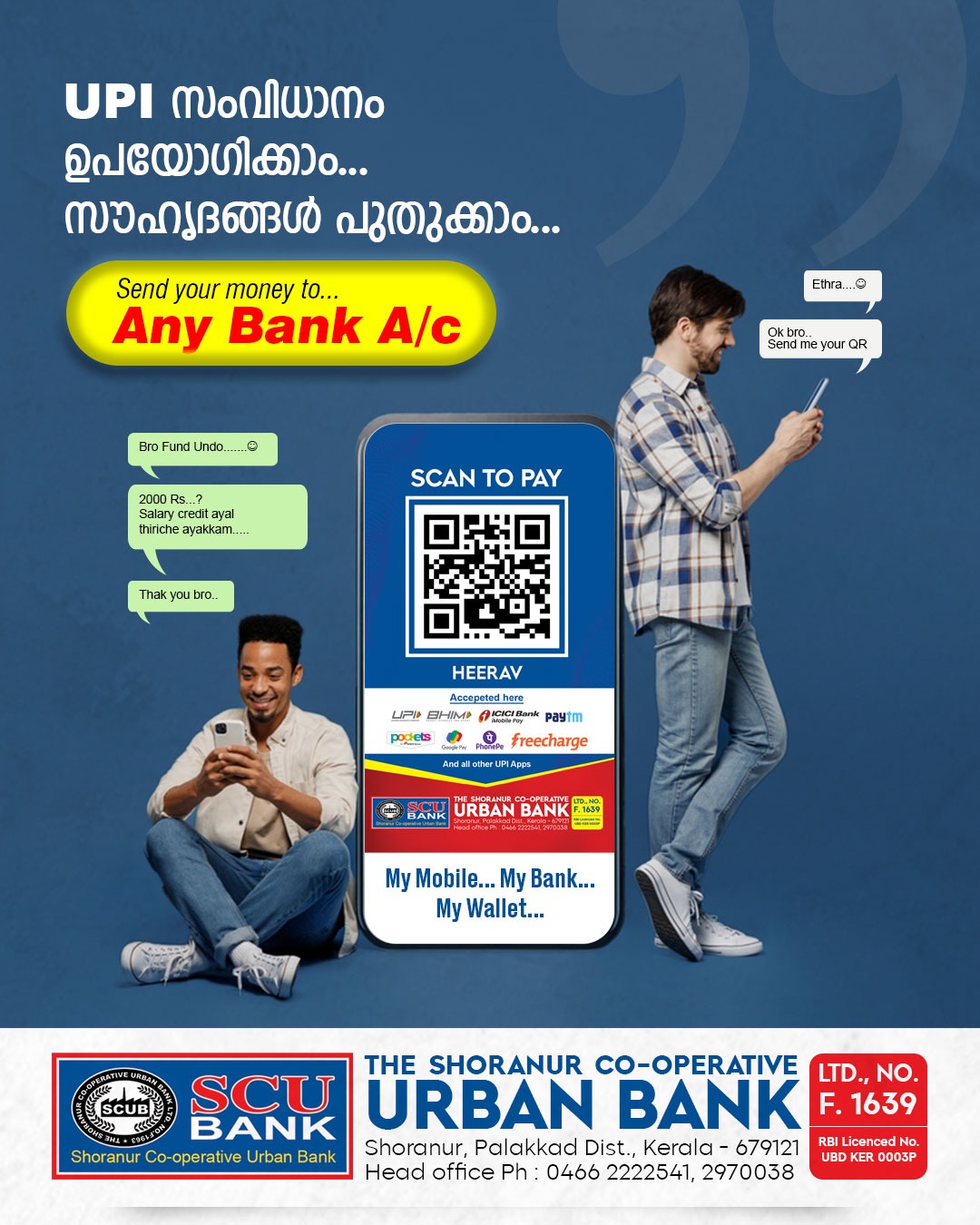 The UPI (Unified Payments Interface) service from The Shoranur Cooperative Urban Bank enables fast and seamless fund transfers using your smartphone. You can send or receive money instantly using just a UPI ID or Mobile Number without the need for bank account details.